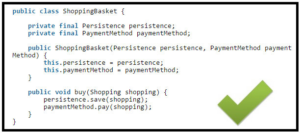 ¿Se nota la diferencia? Ahora ya no hay dependencia de la implementación particular que uno decida. Pero aún tenemos que seguir instanciándolo en ShoppingBasket.