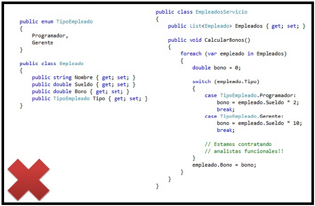 lo cual es ineficiente ya que si existiera más tipos de empleados, por ejemplo 100, este bloque switch se llenaría de 100 casos lo cual dificultaría el