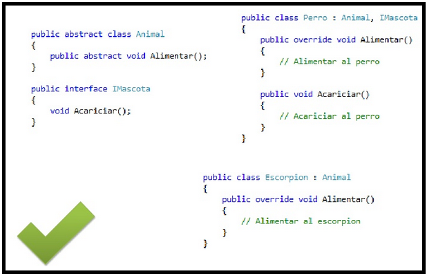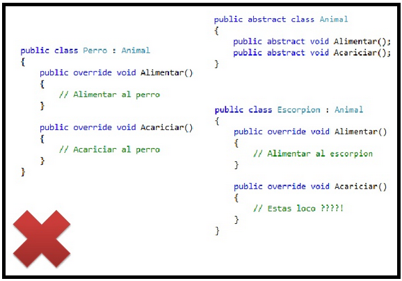 Se puede visualizar que la clase Escorpión al extender de la clase abstracta Animal, se debería alimentar y acariciar al objeto, lo cual en este contexto