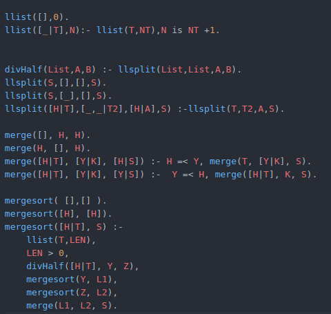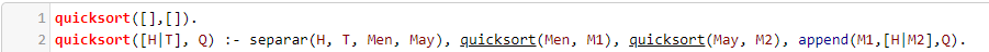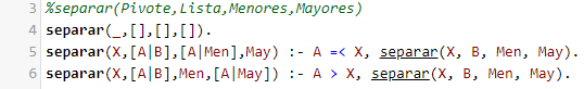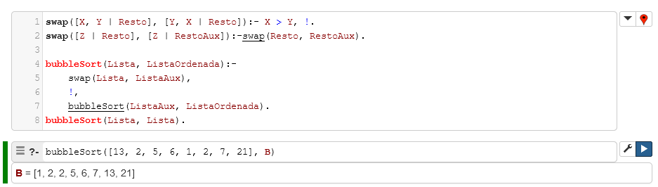 En Prolog, para el algoritmo de Bubble Sort es necesario comparar los dos elementos de la lista restante en cada evaluación recursiva y hacer el intercambio de estos en una lista auxiliar, hasta obtener la lista ordenada. La implementación en Prolog se presenta a continuación: