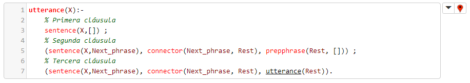 La sexta y última regla, para la verificación de articulaciones (las estructuras sintácticas más generales, análogas a lo que sería el programa si se tratara d eun lenguaje de programación), es utterance(...), y tiene varias cláusulas: