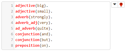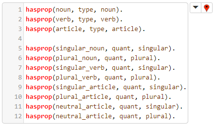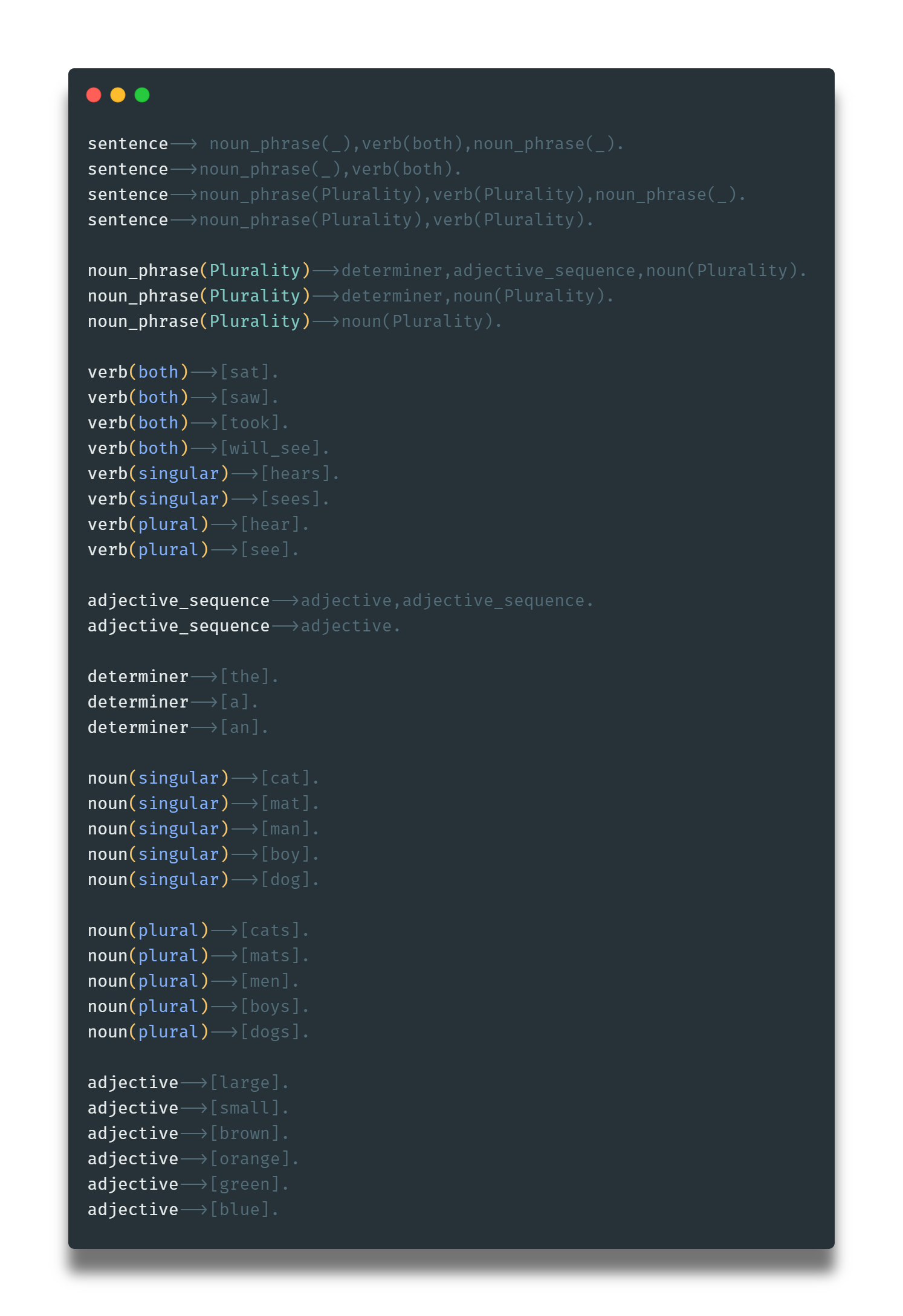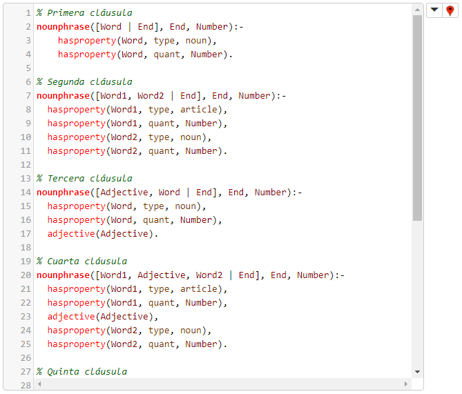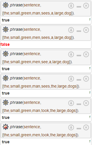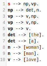 Nótese que, por un lado, si el verbo y la frase nominal que le sigue tienen ambos el mismo número gramatical es irrelevante, por lo que el valor de Number en nounphrase(..., Number) es _, y que, por otro lado, el axioma anteriormente declarado ad_adverb(quite). significa que la palabra inglesa 'quite' es un adverbio que puede modificar a otro adverbio.