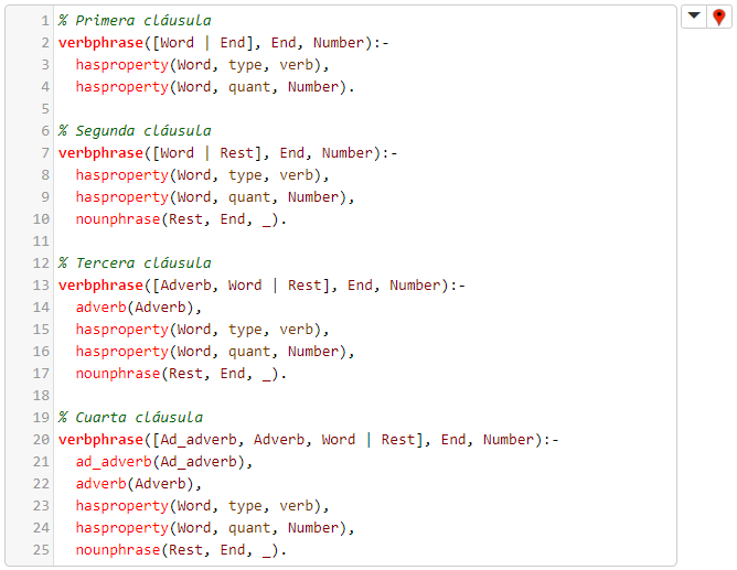 La segunda regla, para la verificación de frases verbales, es verbphrase(...), y cuenta con varias cláusulas: