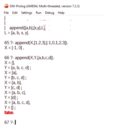 - Objetivos: esta sección permite ejecutar los programas de forma no interactiva, y por tanto, buscará la solución deseada tan pronto como se ejecute el programa. Como también es habitual usar Prolog de forma interactiva es frecuente ejecutar un programa y luego esperar a que se nos pregunte por los objetivos.