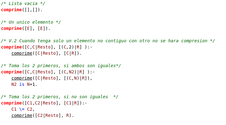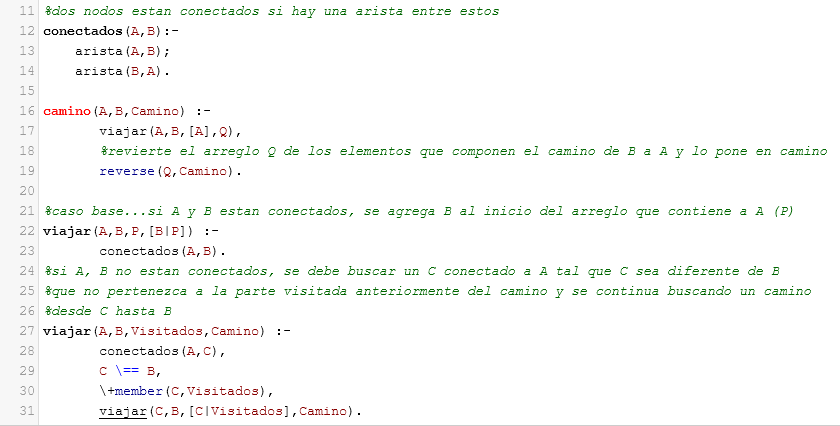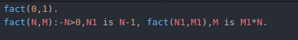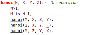 Y el caso recusivo, es cuando N>1 en el cual podemos definir que primero pase N-1 discos de A a B, usando C, luego el disco que queda lo pasamos de A a C, y en última instancia se pasarían los discos que hay en B a C. Lo definimos en Prolog de la siguiente manera.