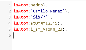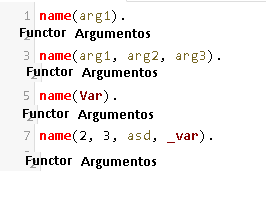 Atomos o functores: Se utilizan para nombrar objetos, propiedades o relaciones. Deben empezar en minúscula (ejemplo luis, pedro, gato, edad, :-, ?-).