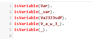 Variables: Las variables en Prolog se representan mediante cadenas formadas por letras, dígitos y el símbolo de subrayado,también con una letra mayúscula en su inicio, una excepción es la variable anónima ‘_’. (ejemplo X, Y, Resultado, _nombre, _).