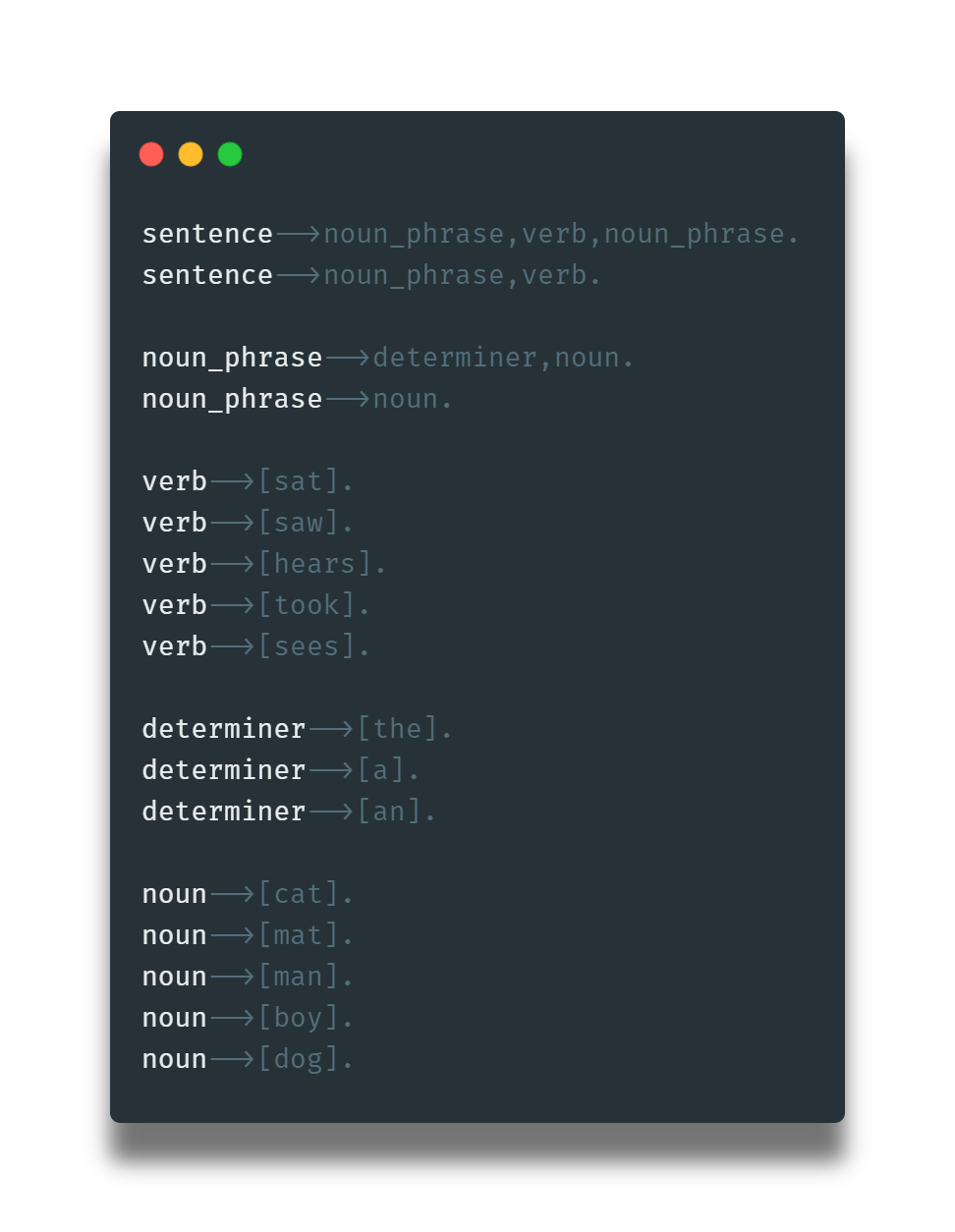Las reglas sintácticas del inglés están pensadas en términos de los tipos de lexema propios del lenguaje, que en la práctica deben ser reemplazados por lexemas particulares. Por esa razón se construye la estructura axiomática del sistema formal que modela la gramática del inglés con un arbol que progresa desde las categorías más generales hasta los lexemas particulares — en términos formales, se progresa desde los símbolos de la gramática hasta los valores terminales.