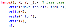 El caso base, que es cuando en la varilla A hay un sólo elemento, por lo cual el disco se mueve directamente a C. Lo definimos de la siguiente manera en Prolog
