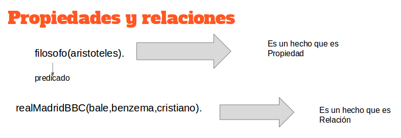 Los hechos pueden construir propiedades o relaciones. Cuando están compuestos por un único argumento (monádicos), se dice que es una propiedad. Cuando se forman con dos o más argumentos (poliádicos), construyen relaciones. Existe una serie de reglas que se deben tener presentes al momento de definir un predicado.