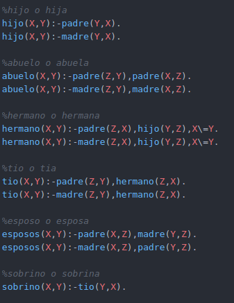 Podemos observar que el tipo de hechos que se presentan en la imagen son relaciones. Tenemos la relación entre dos personas, esta relación podremos llamarla progenitor. Por tanto los hechos que describen el árbol de la imagen quedan definidos como: