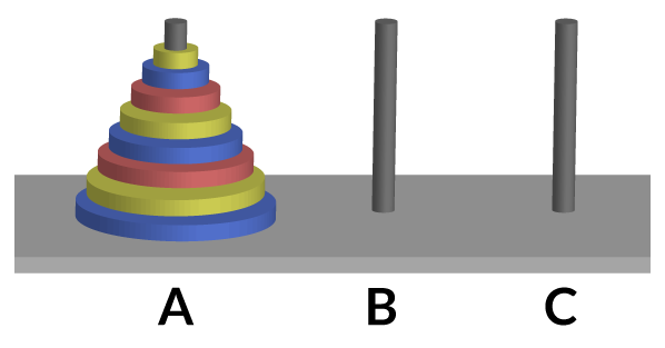 - Hay otras dos varillas que no tienen discos, una es nuestro objetivo donde queremos pasar los discos de forma ordenada y la otra nos va a servir de auxiliar.